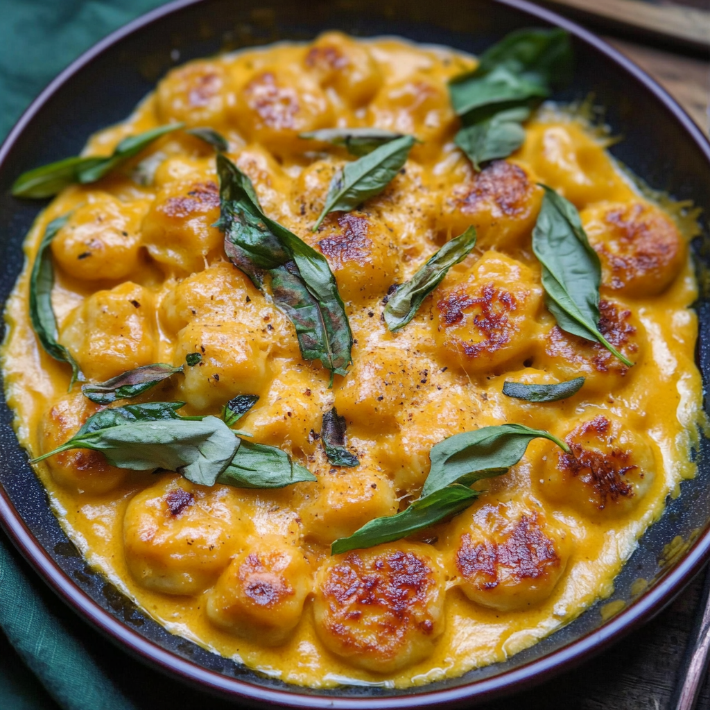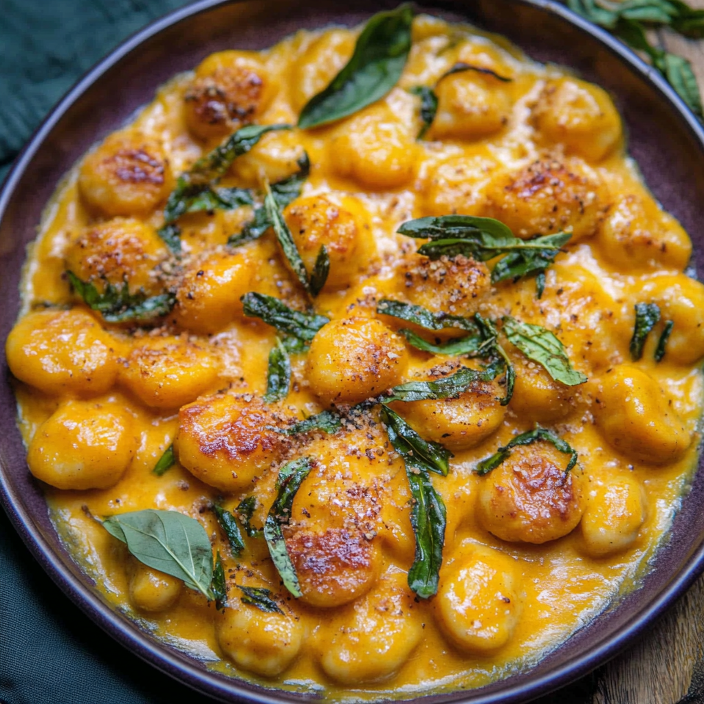- In a large bowl, mix cooked pumpkin and gnocchi with vegetable stock, cream, cheese, and sage.