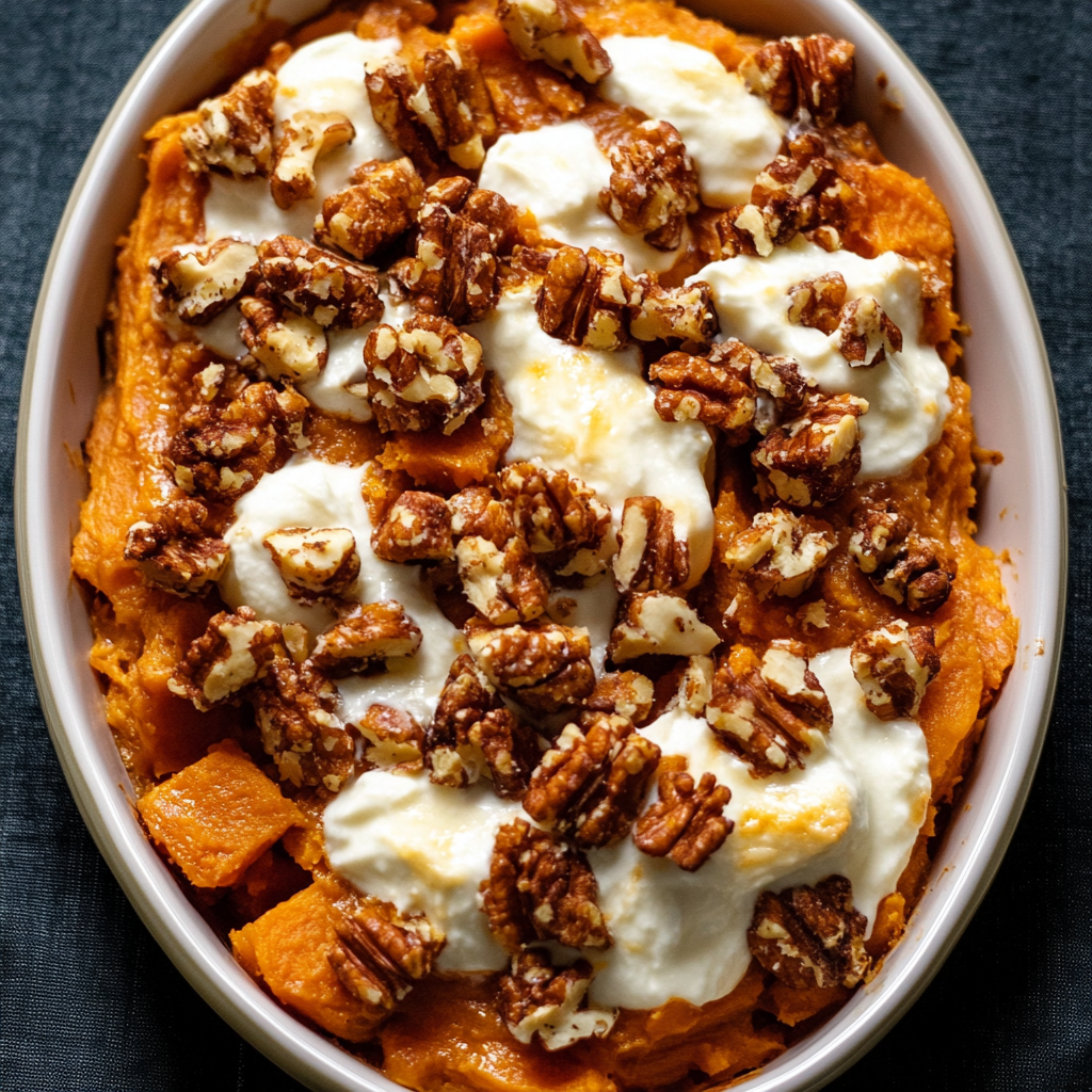 - Spread the mashed sweet potato mixture evenly in a baking dish and top with the topping mixture.